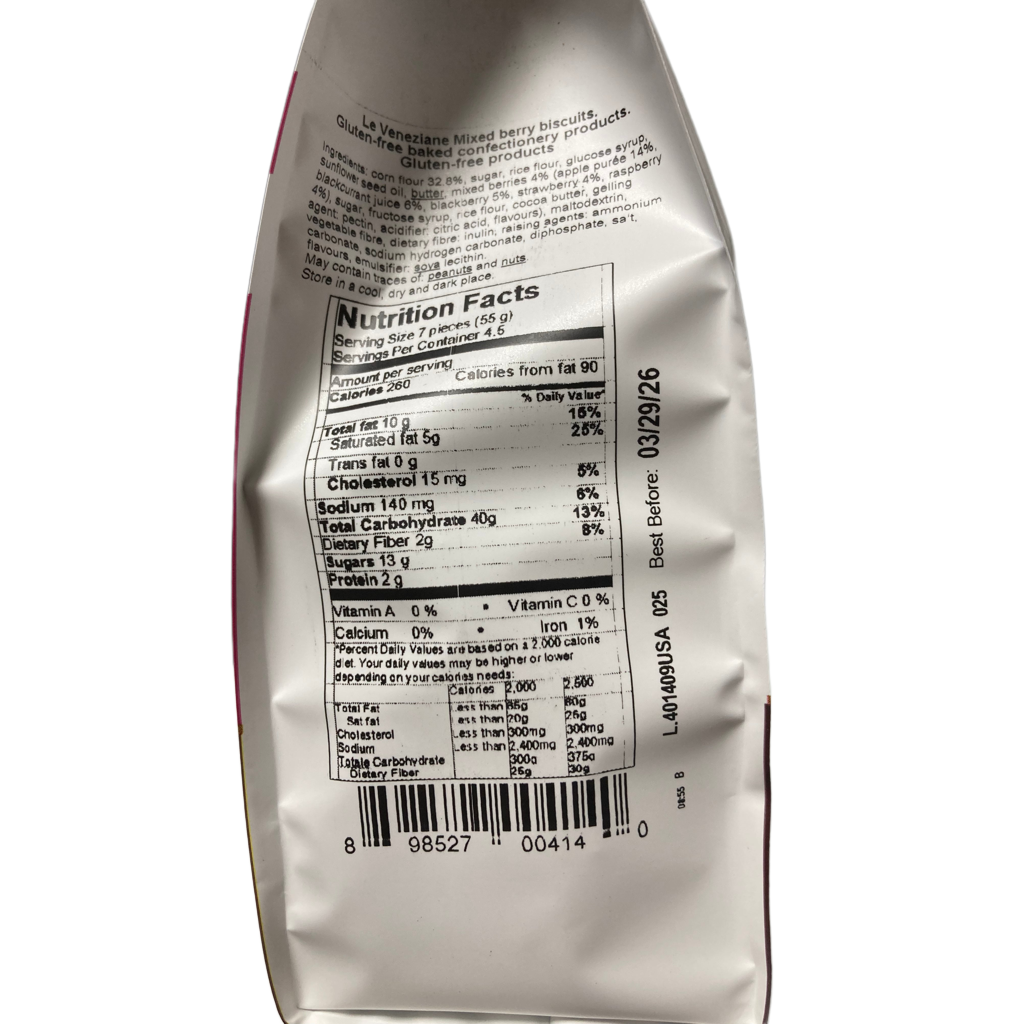 Le Veneziane Gluten-Free Corn-Based Biscuits are deliciously crispy Italian cookies made without gluten, perfect for a sweet treat at any time of day. Available in three indulgent flavors — Cocoa & Hazelnut, Forest Fruits, and Chocolate Chip — each variety is made with high-quality ingredients for a satisfying crunch and rich flavor.